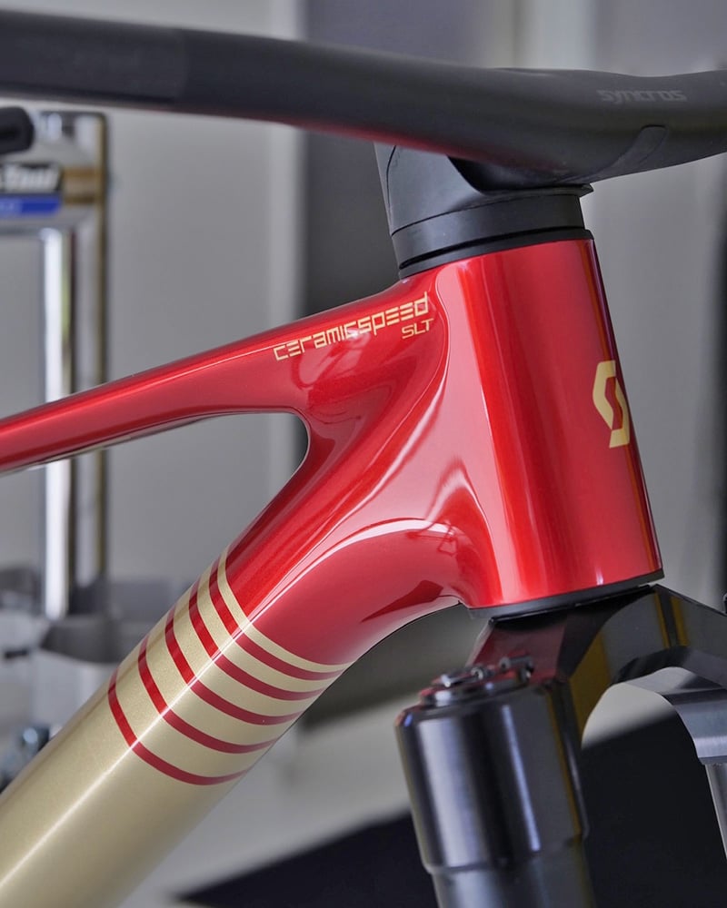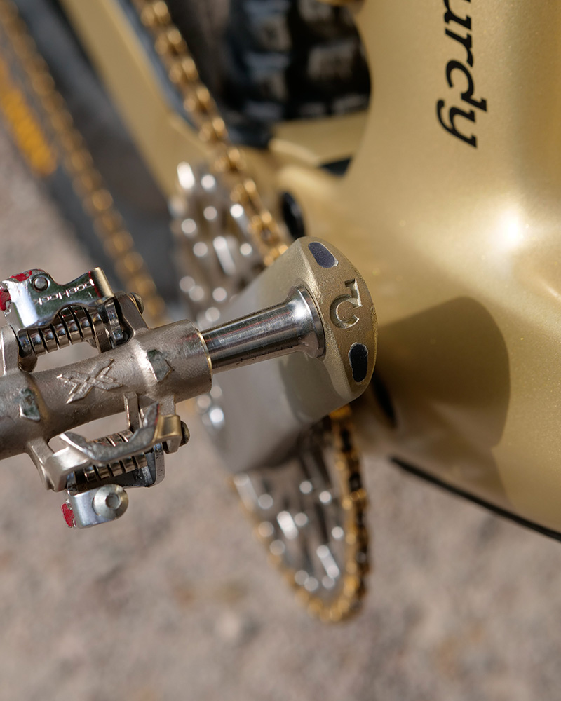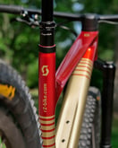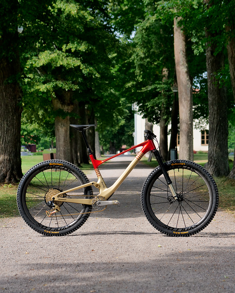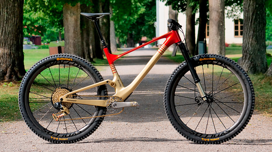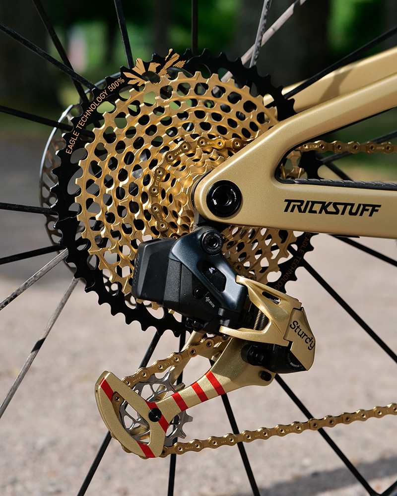 Dangerholm testete an diesem Rad einerseits neue Lackierungen aus, andererseits widmete er sich der Kabelintegration. Als Basis für dieses Rad dient ein Scott Spark Tuned Rahmen, der hier in einer wunderschönen gold-roten Lackierung auffährt. Dangerholms Highlight bei den Parts ist die Kurbel von Sturdy Cycles. Hierbei handelt es sich um eine 3d gedruckte Titankurbel - dazu gibt es das passende, gefräste Titan Kettenblatt und entsprechende Schaltwerkröllchen von Sturdy Cycles. Ein weiteres verstecktes Detail stellt der CeramicSpeed SLT Steuersatz dar. SLT steht für Solid Lube Technology. Hierbei ist das Lager mit einem festen, kunststoffähnlichen Material gefüllt anstelle mit herkömmlichen Fett. So kann weder Wasser noch Dreck in die Lager eindringen - eine Wartung entfällt. Als Laufräder kommen die Syncros Silverton SL zum Einsatz. Die Felgen und Speichen werden aus einem Stück Carbon hergestellt, wobei die Carbonfasern in den Speichen von einer Seite des Laufrades zur anderen reichen. Die Speichen werden anschließend auseinandergepresst und die Nabenschale eingesetzt und befestigt. Alles in allem sorgt dies für reaktionsschnelle Laufräder die ein unglaubliches Fahrgefühl vermitteln. Beeindruckend oder? Ein relativ günstiges Tuningteil stellen die Xpedo M-Force 8Ti Pedale dar. Diese verzeichnen ein Gewicht von 213g und sind damit fast 100g leichter als handelsübliche XTR Pedale. Wer auf den tollen Komfort eines XTR Pedals verzichten kann, bekommt mit dem Xpedo eine spannende Alternative.