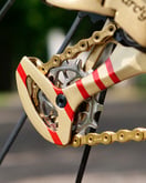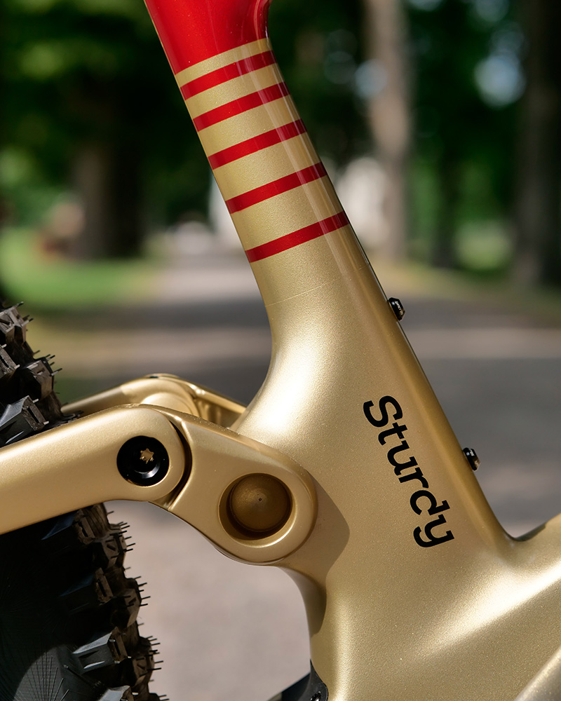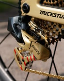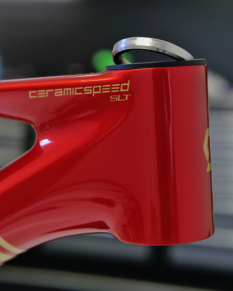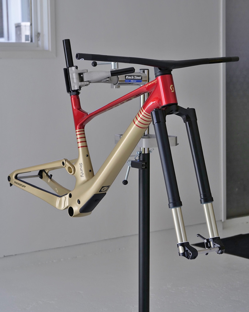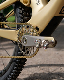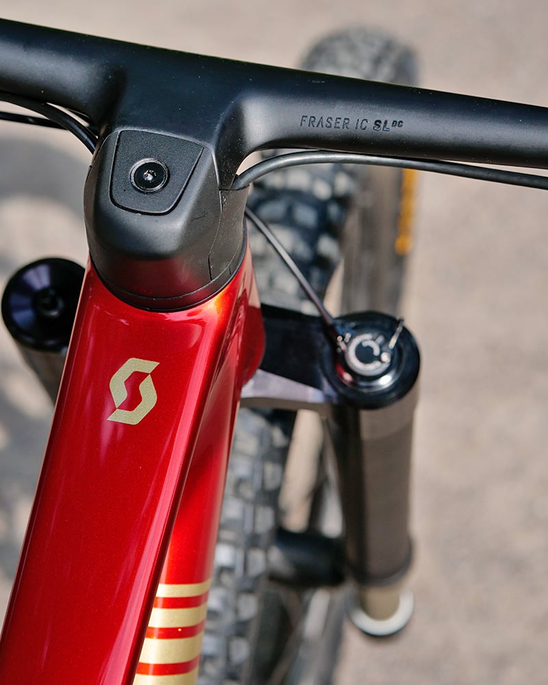 Dangerholm testete an diesem Rad einerseits neue Lackierungen aus, andererseits widmete er sich der Kabelintegration. Als Basis für dieses Rad dient ein Scott Spark Tuned Rahmen, der hier in einer wunderschönen gold-roten Lackierung auffährt. Dangerholms Highlight bei den Parts ist die Kurbel von Sturdy Cycles. Hierbei handelt es sich um eine 3d gedruckte Titankurbel - dazu gibt es das passende, gefräste Titan Kettenblatt und entsprechende Schaltwerkröllchen von Sturdy Cycles. Ein weiteres verstecktes Detail stellt der CeramicSpeed SLT Steuersatz dar. SLT steht für Solid Lube Technology. Hierbei ist das Lager mit einem festen, kunststoffähnlichen Material gefüllt anstelle mit herkömmlichen Fett. So kann weder Wasser noch Dreck in die Lager eindringen - eine Wartung entfällt. Als Laufräder kommen die Syncros Silverton SL zum Einsatz. Die Felgen und Speichen werden aus einem Stück Carbon hergestellt, wobei die Carbonfasern in den Speichen von einer Seite des Laufrades zur anderen reichen. Die Speichen werden anschließend auseinandergepresst und die Nabenschale eingesetzt und befestigt. Alles in allem sorgt dies für reaktionsschnelle Laufräder die ein unglaubliches Fahrgefühl vermitteln. Beeindruckend oder? Ein relativ günstiges Tuningteil stellen die Xpedo M-Force 8Ti Pedale dar. Diese verzeichnen ein Gewicht von 213g und sind damit fast 100g leichter als handelsübliche XTR Pedale. Wer auf den tollen Komfort eines XTR Pedals verzichten kann, bekommt mit dem Xpedo eine spannende Alternative.
