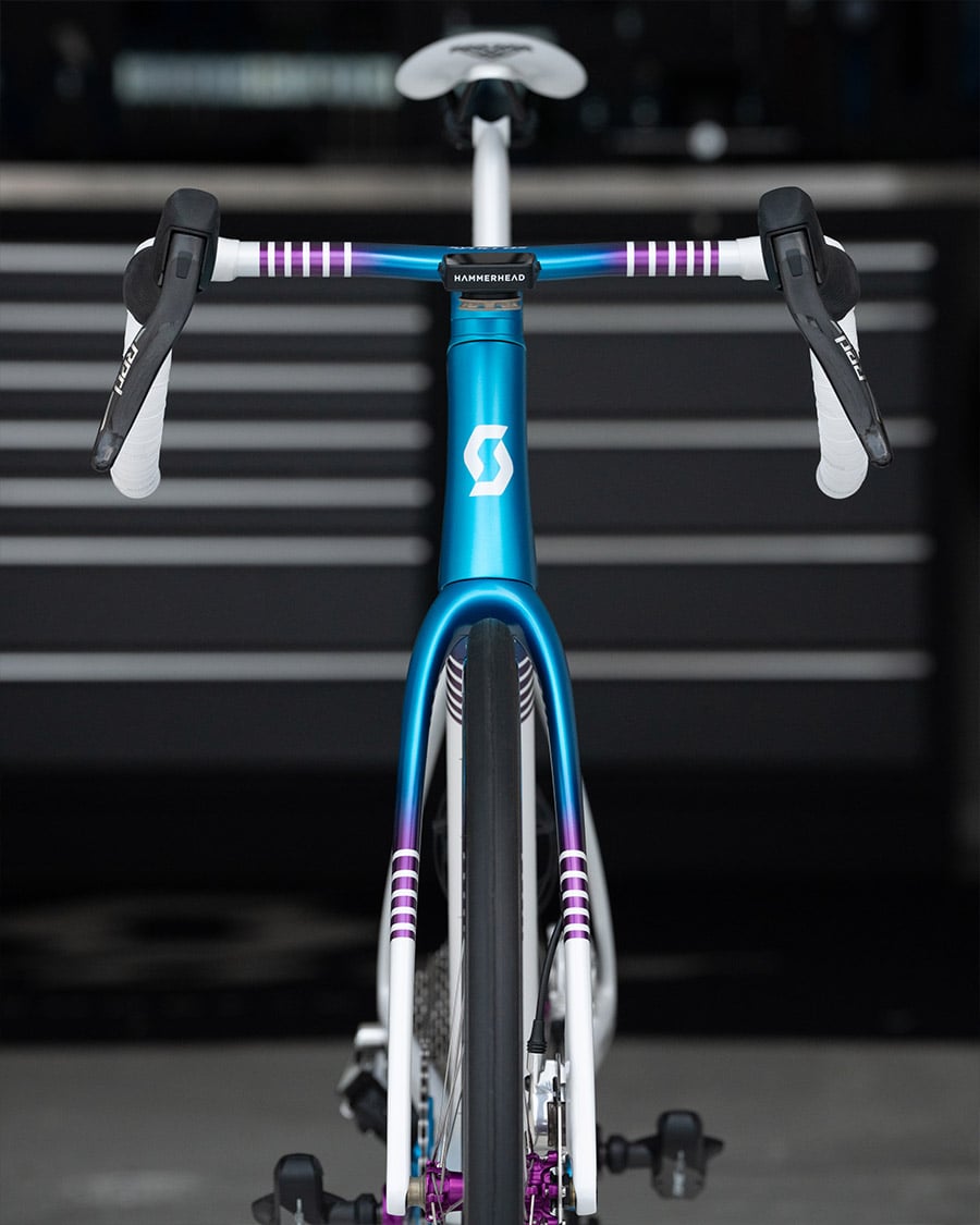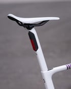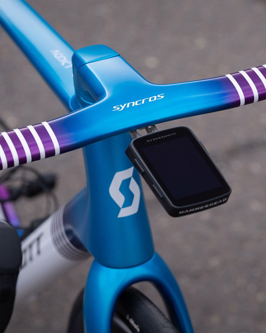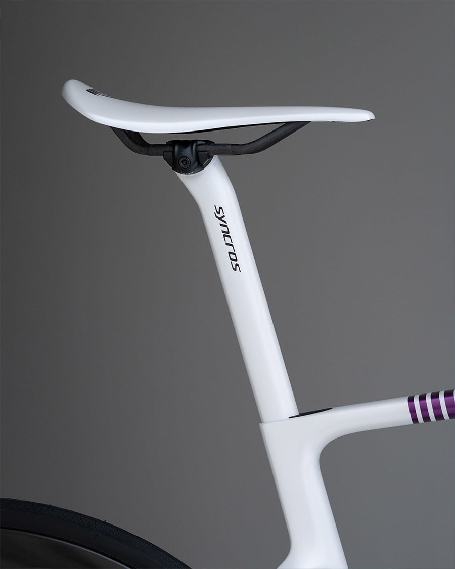 Während alle beeindruckt mit dem Kopf nickten, dachte sich Dangerholm eher: da geht doch noch was! Er nahm sich einen HMX Rahmen, also die etwas schwerere Version in Größe L, die es noch immer auf beeindruckende 749.9g bringt. Dieser Rahmen bekam die übliche liebevolle Behandlung und ein neues Finish. Für den Aufbau kam nicht nur die neue Lenker Vorbau Einheit von Syncros zum Einsatz – die IC-R100 SL – sondern auch die beiden neuen Sattelstützen SP-R100-SL und die SP-R101-CF. Während die SL die perfekte Wahl für Gewichtsfetischisten ist, ist die CF Dangerholms persönlicher Favorit, denn das perfekt integrierte Rücklicht bietet einfach einen enormen Mehrwert.