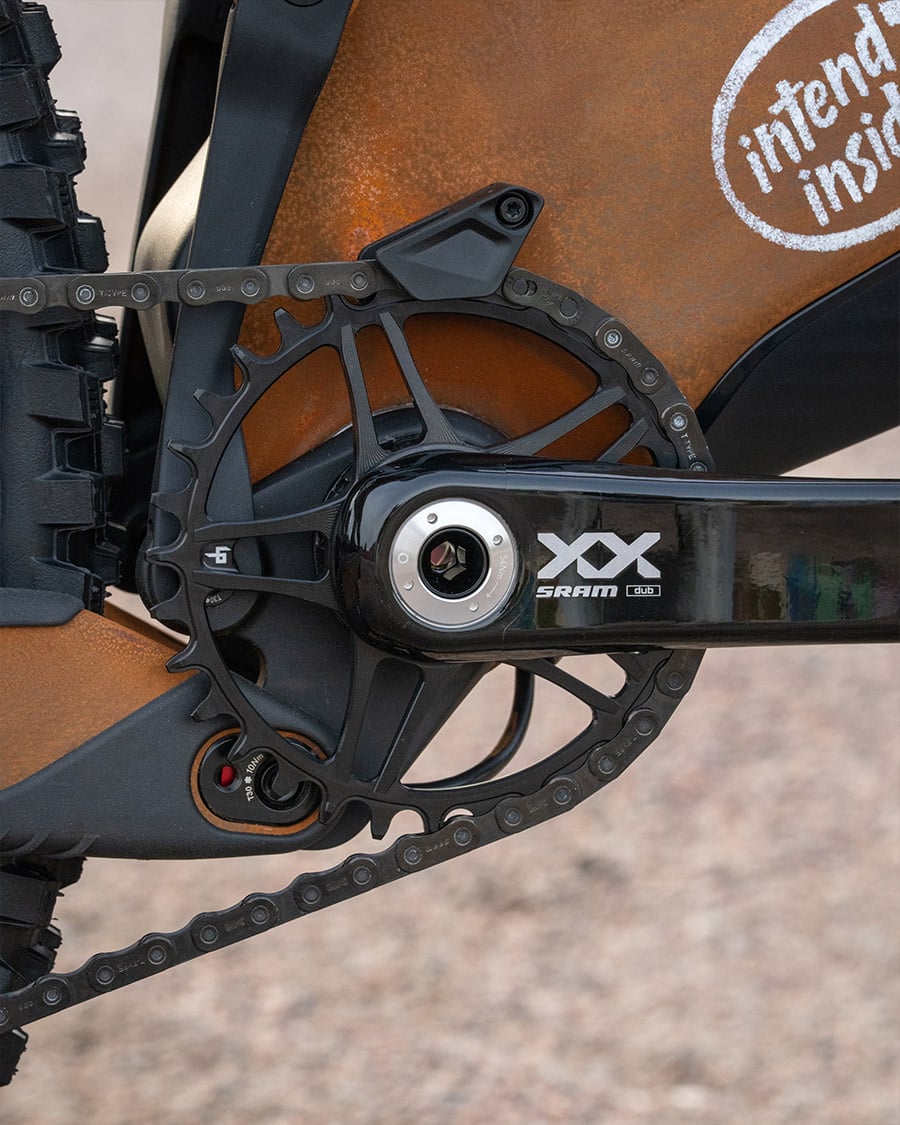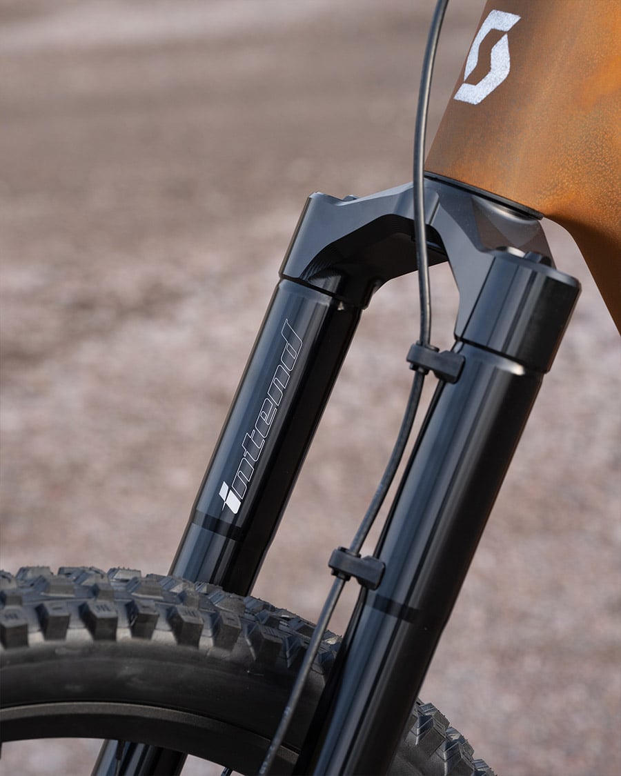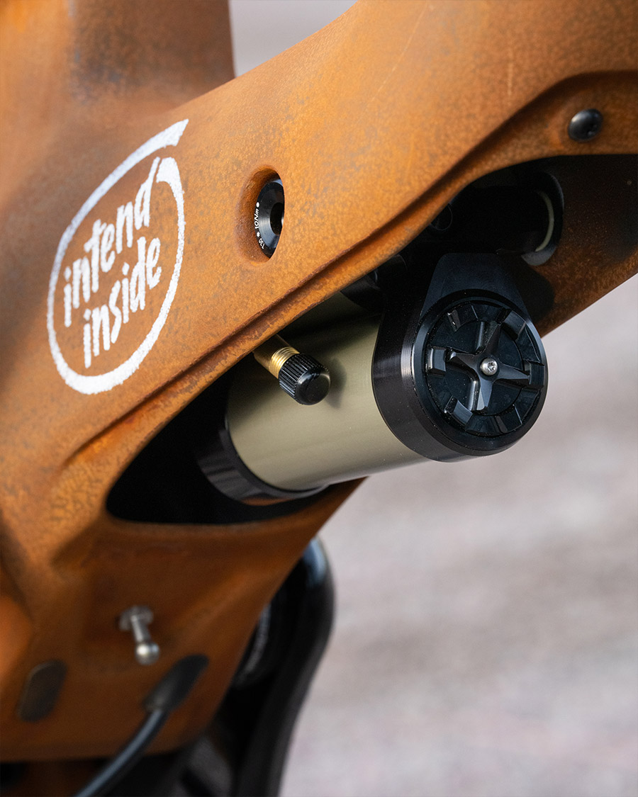 Technisches Highlight bildet das komplette Intend-Fahrwerk. Auffällig an der Front ist die mächtige Intend Edge Blackline, die je nach Einstellung mit 170 oder 180mm Federweg aufwartet. Gut versteckt im Rahmen werkelt ein Intend Hover, der erst vor kurzem überarbeitet auf den Markt gekommen ist.