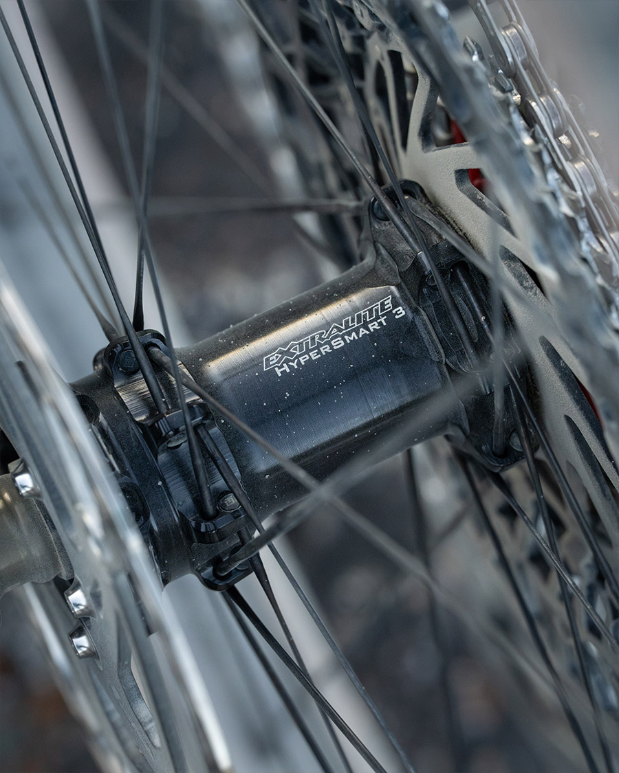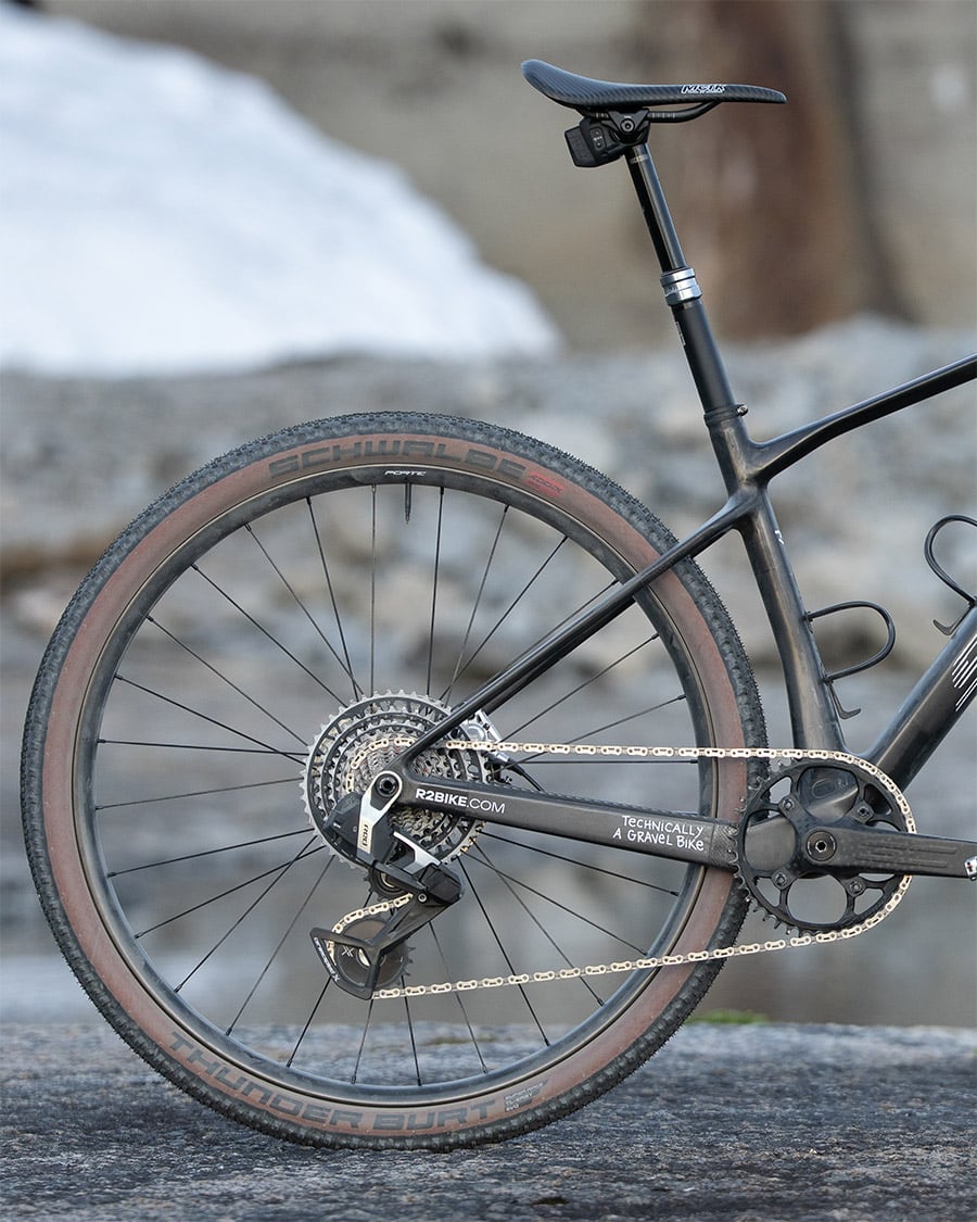 Der zweite Aufbau legt Wert auf Vielseitigkeit, vor allem in rauerem Gelände. Mit einer Dropper, die ebenfalls wieder über die RED Schalthebel gesteuert wird und Felgen, die über eine 40 mm Innenweite verfügen, fühlt sich das Rad auch in schwierigem Gelände wohl. Die Tunder Burt können mit einem niedrigeren Reifendruck bewegt werden und behalten aufgrund der enormen Felgen trotzdem ihre Stabilität. Bei hohen Geschwindigkeiten liefern sie mehr Komfort und bessere Haftung. Und die Dropper? Die wurde nicht primär für den Einsatz in technischem Gelände verbaut sondern für Schotterabfahrten, auf denen es bei hohen Geschwindigkeiten gut holpert. In solchen Situationen räumt man den Sattel aus dem Weg und kann sich auf dem Rad freier bewegen. Natürlich lohnt sich der Droppereinsatz auch, wenn man bei hohen Geschwindigkeiten in eine aerodynamischere Position möchte und tief ducken will.