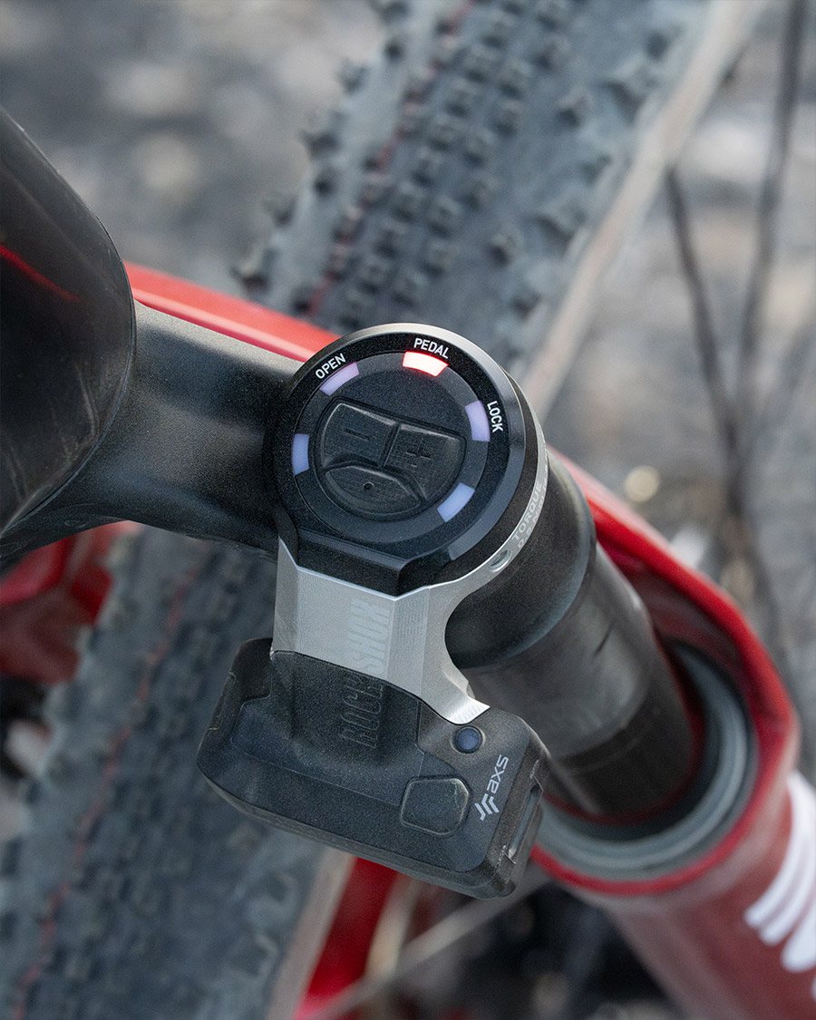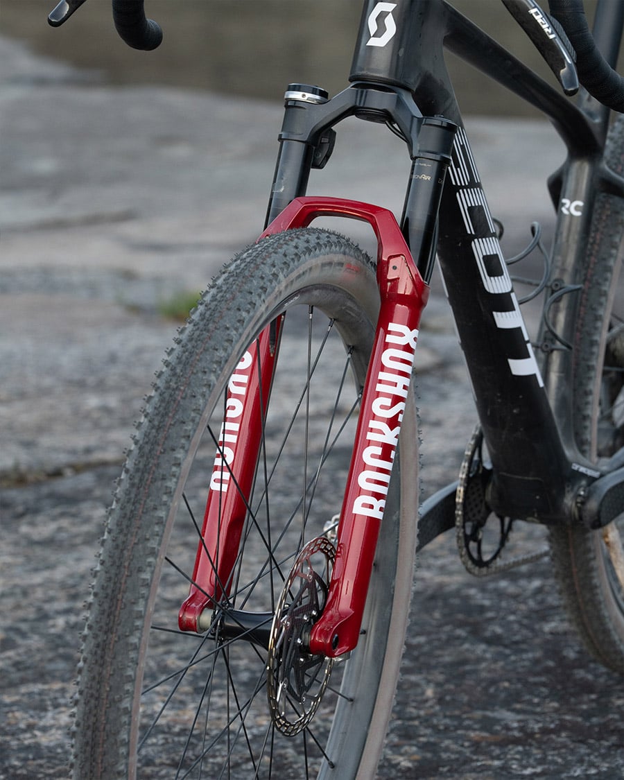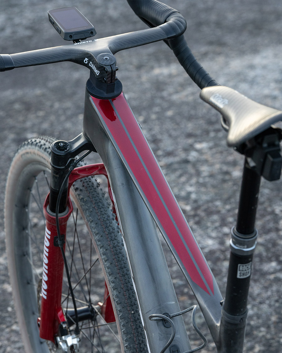 Obwohl Dangerholm schon viele Jahre starre MTBs für den schnellen Graveleinsatz genutzt hatte, reizte ihn bis vor kurzem nichts, Federgabeln offiziell auch in Gravelräder zu verbauen. Es fehlte den Gabeln schlichtweg das letzte Quäntchen Technologie, um sie ergonomisch angenehm, vollständig durch alle Federungsmodi schalten zu können. Das änderte sich nun mit einem Update seitens RockShox: Das Flight Attendant System ist nun auch im „Fork only“ Modus sinnvoll nutzbar. In Kombination mit den SRAM RED AXS Schalthebeln ist es problemlos möglich, durch die Federungsmodi zu schalten. Mit der Verwendung eines Powermeters in der Kurbel kann die Federung sogar im Automatikmodus betrieben werden – und kümmert sich je nach Untergrund um sich selbst.