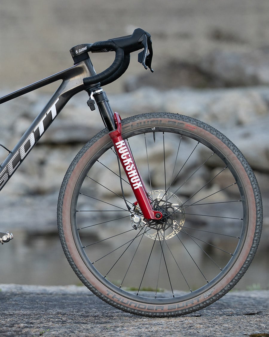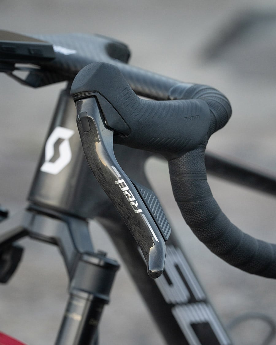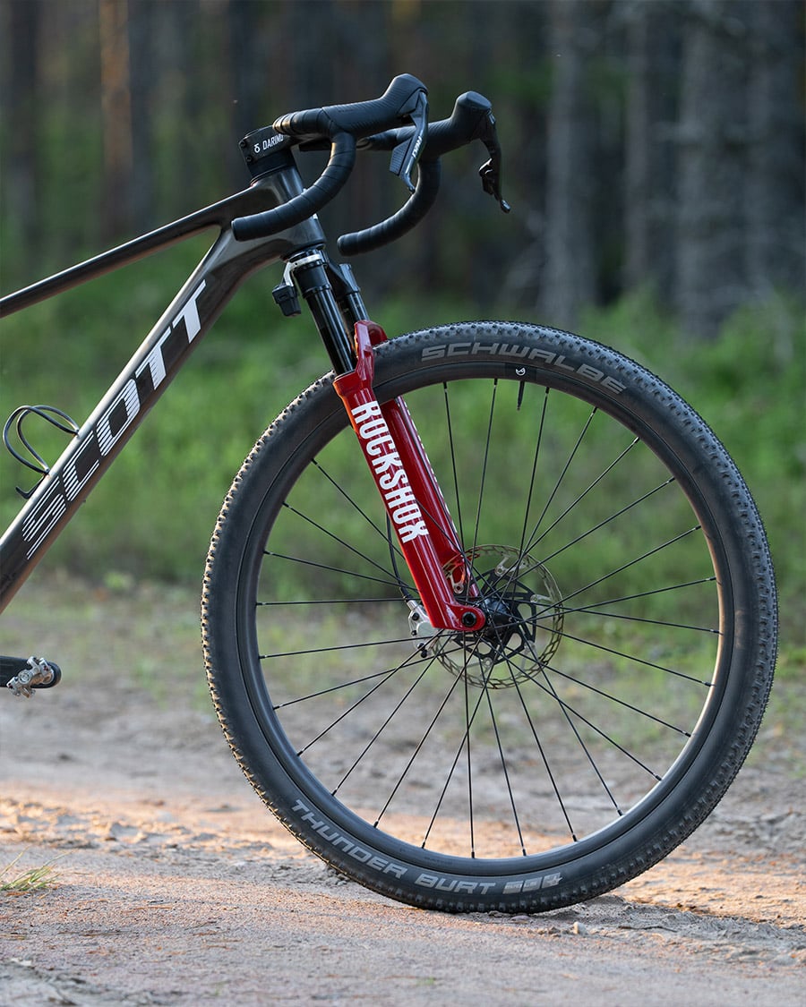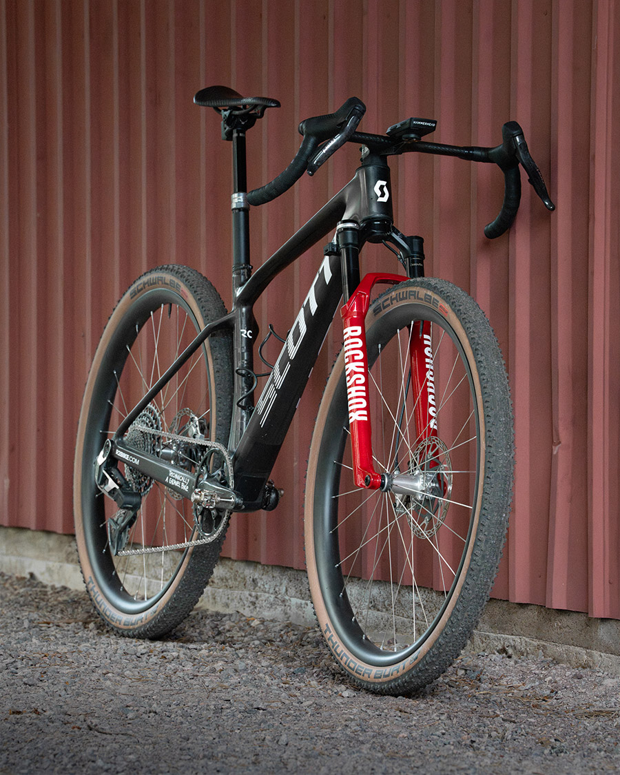 Obwohl Dangerholm schon viele Jahre starre MTBs für den schnellen Graveleinsatz genutzt hatte, reizte ihn bis vor kurzem nichts, Federgabeln offiziell auch in Gravelräder zu verbauen. Es fehlte den Gabeln schlichtweg das letzte Quäntchen Technologie, um sie ergonomisch angenehm, vollständig durch alle Federungsmodi schalten zu können. Das änderte sich nun mit einem Update seitens RockShox: Das Flight Attendant System ist nun auch im „Fork only“ Modus sinnvoll nutzbar. In Kombination mit den SRAM RED AXS Schalthebeln ist es problemlos möglich, durch die Federungsmodi zu schalten. Mit der Verwendung eines Powermeters in der Kurbel kann die Federung sogar im Automatikmodus betrieben werden – und kümmert sich je nach Untergrund um sich selbst.