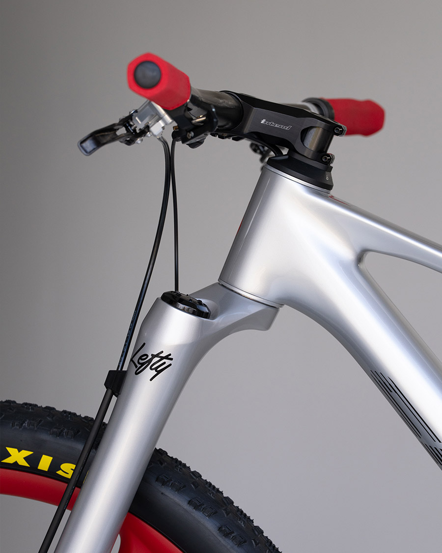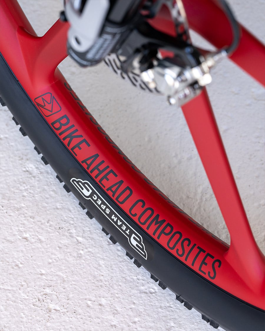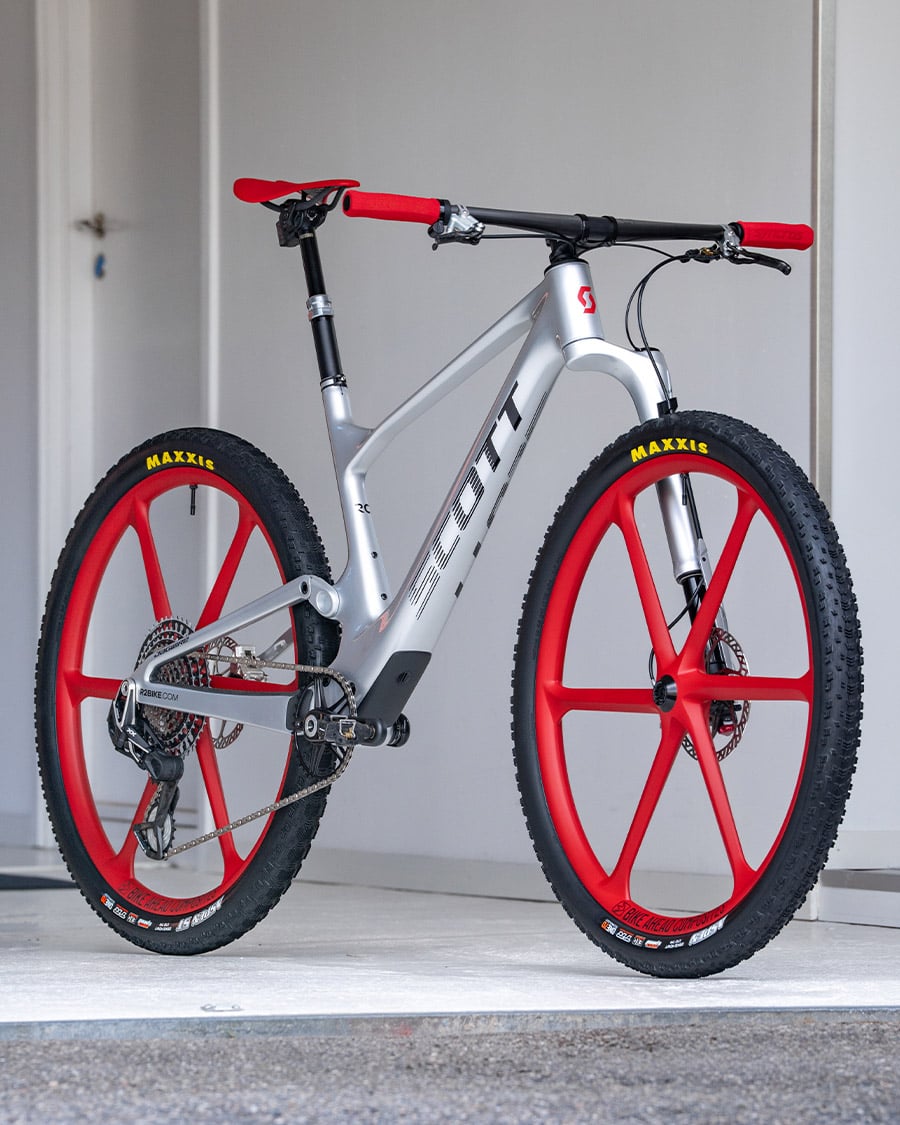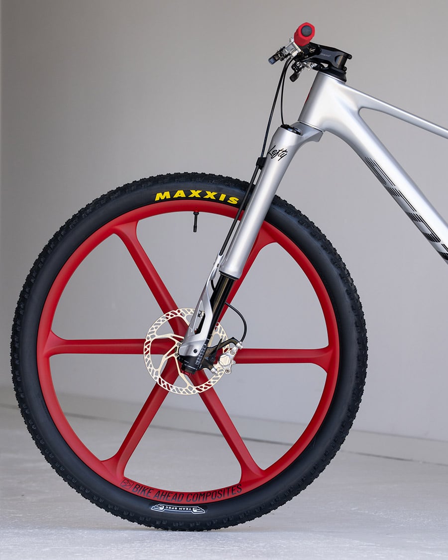 Diese Kombination wird noch durch Bike Ahead Composites Biturbo RSX Laufräder ergänzt, die im markanten Rot daherkommen. Nicht nur optisch stechen diese hervor, auch die technischen Werte wissen zu überzeugen: Mit einem Gewicht von nur 1329 g trotz ihrer massiven 33-mm-Felgeninnenbreite bieten sie großartige Traktion und Komfort und sind zudem sehr reaktionsfreudig. Für Rennmaschinen kommen nur ausgewählte Reifen zum Einsatz – Maxxis stellt die Team Spec Varianten der 29x2.4“ Maxxis Aspen und Aspen ST Reifen.