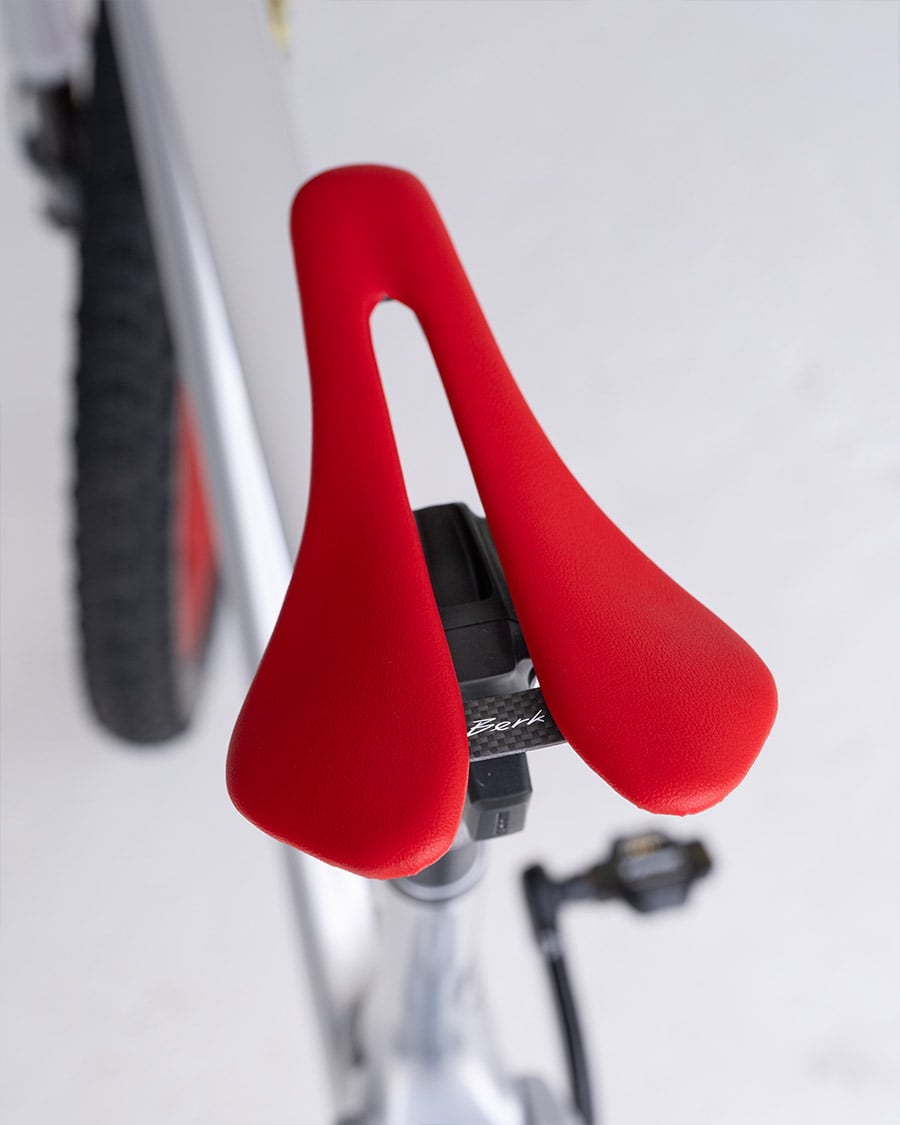 Zuletzt werfen wir noch einen Blick auf die Kontaktpunkte: Als Griffe kommen die sehr komfortablen und dennoch leichten Syncros Foam Griffe zum Einsatz. Bei dem Sattel setzt Dangerholm auf den Lupina Sattel von Berk. Beide Kontaktpunkte zeigen sich in passender, roter Farbgebung. Der Lupina wird in Slowenien handgefertigt, wiegt nur 93,6 g und die Sattelschale ist sehr flexibel, um zusammen mit der Polsterung für zusätzlichen Komfort zu sorgen. Montiert ist er an einer RockShox Reverb AXS Dropper Sattelstütze, die mit der schönen, aber leider nicht mehr erhältlichen Tune Würger Skyline Sattelstützenklemme befestigt ist.