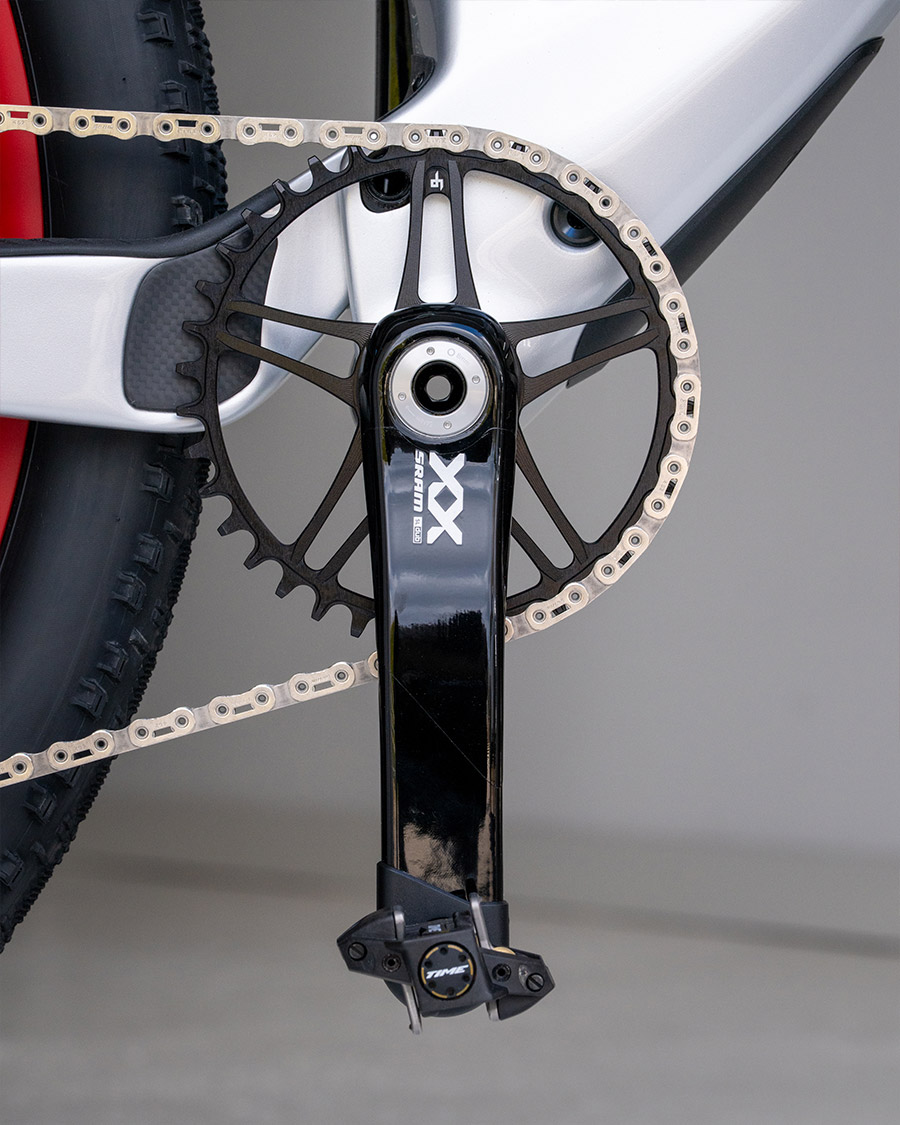 Beim Antrieb lässt Dangerholm nichts anbrennen und setzt auf SRAM XXSL AXS Transmission. Das Schaltwerk erhielt einen OSPW X-Schaltwerkskäfig von CeramicSpeed und ein entsprechendes Tretlager für maximale Leistung. Je nach Einsatzzweck kommen als Kettenblätter entweder das SRAM XXSL Powermeter oder die leichten RadoxX Components Bergakungen zur Anwendung, beide mit 38 Zähnen.